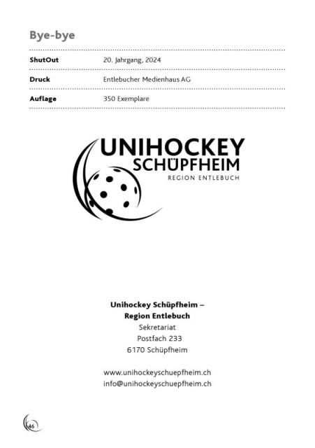 Bye-bye ShutOut 20. Jahrgang, 2024 Druck Entlebucher Medienhaus AG Auflage 350 Exemplare Unihockey Schüpfheim – Region Entlebuch Sekretariat Postfach 233 6170 Schüpfheim www.unihockeyschuepfheim.ch info@unihockeyschuepfheim.ch 46